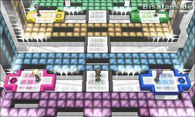 In dieser Arena musst du zunächst die Gegner auf den Plattformen besiegen, um dann die kleinen Schalter betätigen zu können. Diese bewirken, dass sich die Quadrate in der Arena drehen – drehe diese so, dass du einen guten Weg nach vorn findest. Manchmal ist es schlau einen Schritt zurück zu gehen, um nach vorn zu kommen. Hast du di kleine Rätselaufgabe erledigt kannst du schließlich gegen den Arenaleiter spielen, der viele Eistypen besitzt. Dadurch ist er gegen Stahl, Feuer oder Kampfattacken besonders anfällig, aber auch Gestein kann dir gut helfen.