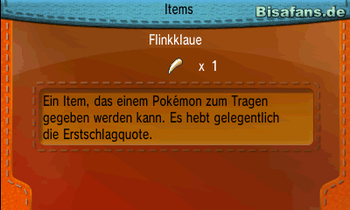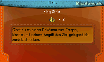 Kommen wir nun zu den anspruchsvolleren Optimierungen. Jedes Pokémon kann exakt einen Gegenstand tragen. Das kann eine einmal einsetzbare Beere sein um z.B. Paralyse zu heilen, eine Sanftglocke um die Zufriedenheit zu steigern, ein Münzamulett um mehr Geld von Trainerkämpfen zu erhalten oder ein Item sein, welches Kampfvorteile verschafft. Die oberen Screens zeigen zwei dieser Items wie die Flinkklaue (erhöht Chancen auf Erstschlag) und King-Stein (kann Gegner zurückschrecken lassen). Setzt man z.B. ein schnelles Pokémon ein, kann der King-Stein verhindern, dass der Gegner überhaupt reagieren kann! Optional kann man einem schnellen Pokémon wie z.B. Abra bzw. seinen Entwicklungen ein verstärkendes Item wie den Krummlöffel geben, um den ohnehin hohen Spezial-Angriffswert noch einmal zu erhöhen.