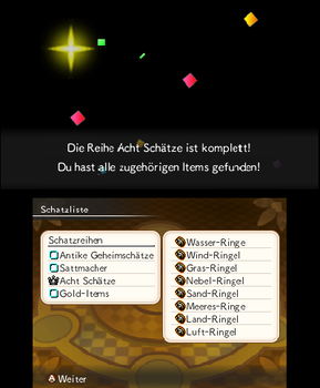 Bis auf die Gold-Items sind alle Schätze Ringel, die teilweise verbesserte Versionen normal im Spiel erhältlicher Ringel darstellen (Antike Geheimschätze) oder ähneln bzw. gleichen den Funktionen bestimmter Sipale (Acht Schätze). Die genauen Beschreibungen zu den Ringeln lassen sich auf unserer Seite zu Ringeln und Sipalen nachlesen.