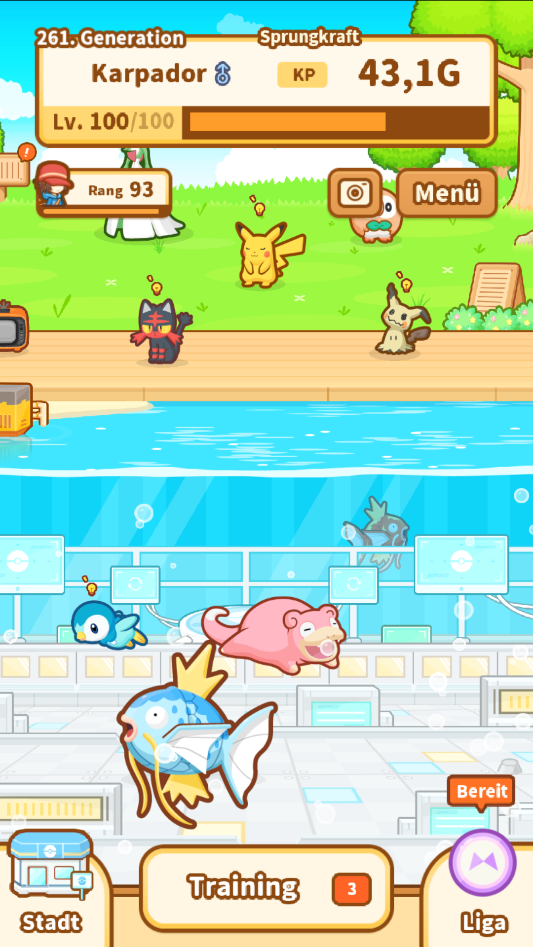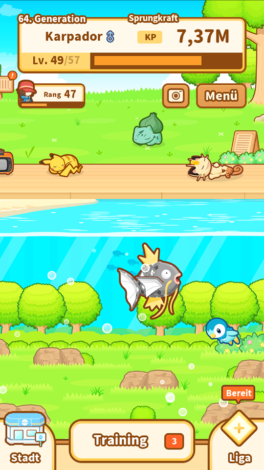 Der Hauptteil des Spieles findet in einem Aquarium statt, in welchem Karpador gefüttert werden kann. Hierbei kann man mit dem Abschluss verschiedener Ligen weitere Stile von Aquarien freischalten, und so frei wählen, wie das eigene aussehen soll.