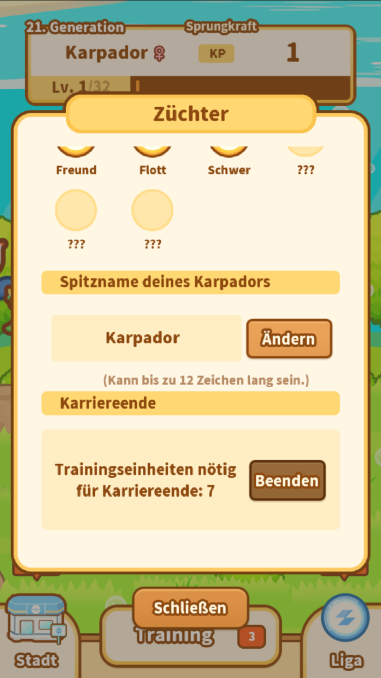 Ab Level 15 könnt ihr im Aquarium über das Feld „Rang” oben links das Karriereende eures Karpadors erzwingen. Dafür müsst ihr jedoch mindestens sieben Trainingseinheiten absolviert haben. Erklärt ihr die Karriere für beendet, wird ein Generationswechsel herbeigeführt.