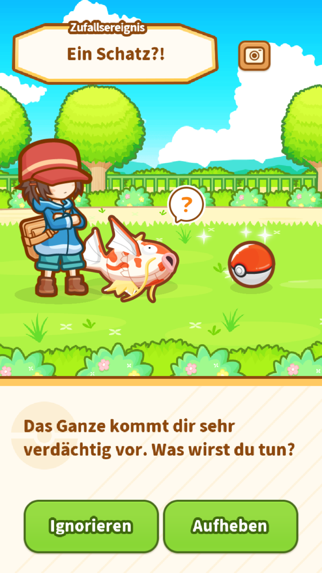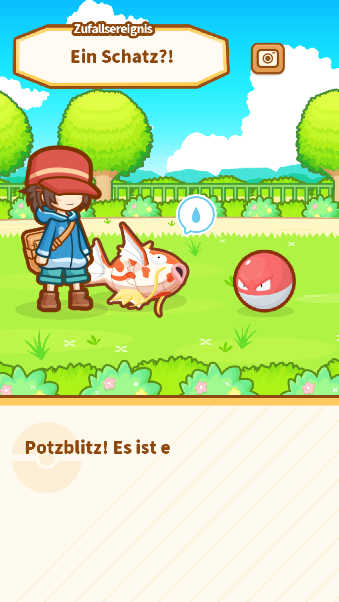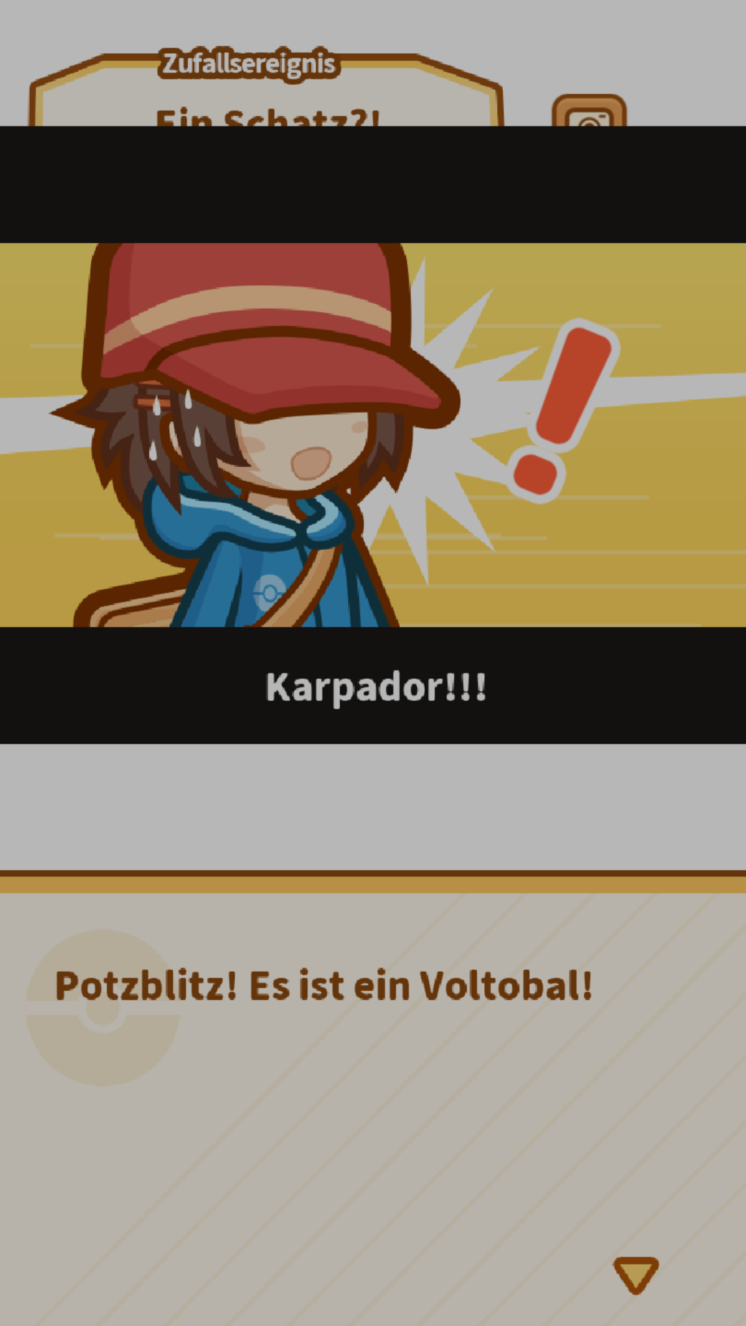 Nach dem Training kann es zu folgendem Ereignis kommen: Karpador findet einen Pokéball auf dem Boden. Manchmal befinden sich in ihm Schätze wie zum Beispiel Münzen oder Diamanten. Es kann aber auch sein, dass es sich hierbei gar nicht um einen Pokéball, sondern um ein gut getarntes Voltobal handelt! Erwischt ihr eins, wird dieses explodieren, was dazu führt, dass Karpador einen Generationswechsel durchführen muss.