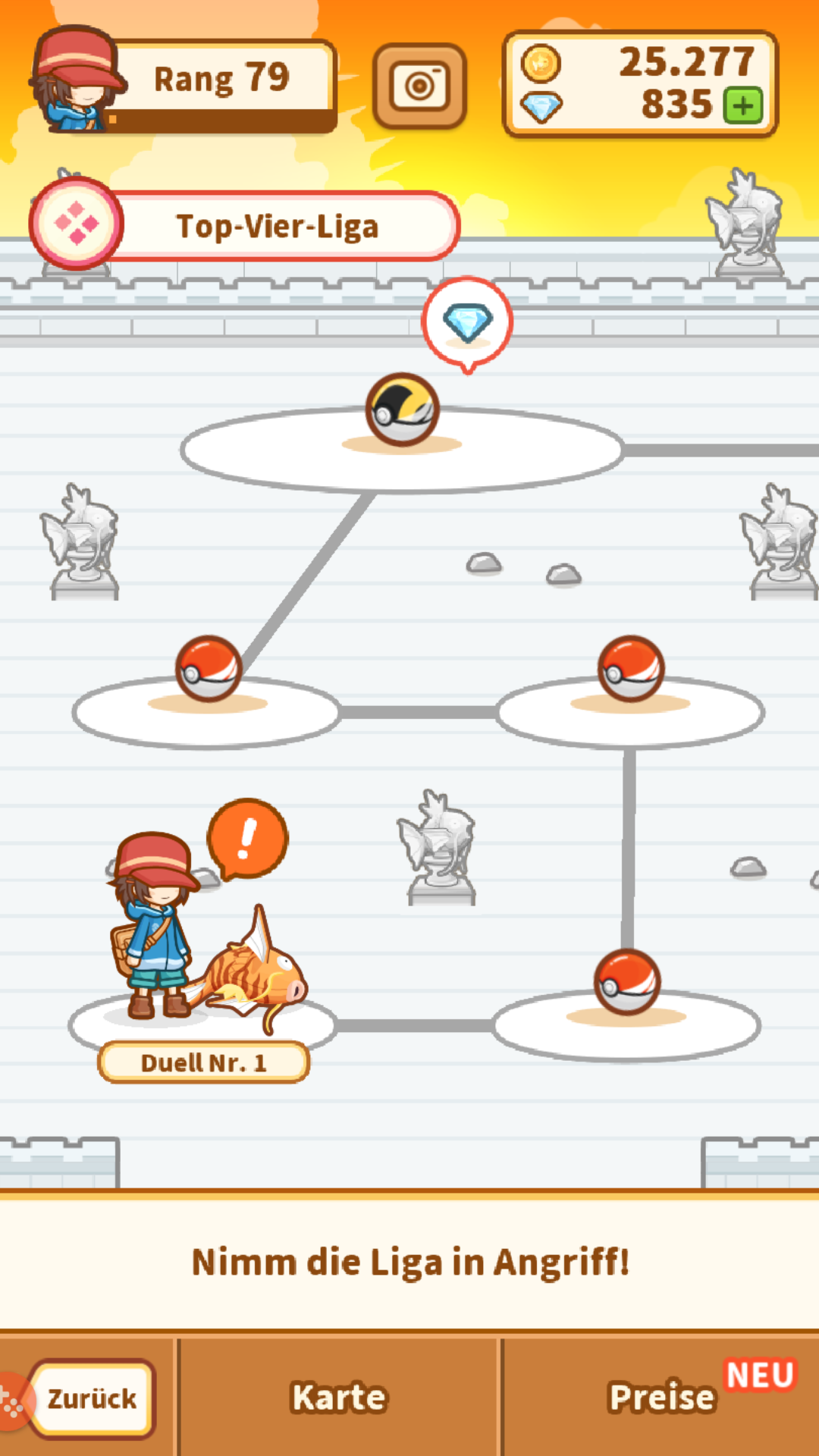 Die Top-Vier-Liga ist die neunte Liga in Karpador Jump und besitzt 20 Gegner. Nach jedem Duell erhaltet ihr 54329 bis 281050 Erfahrungssterne.