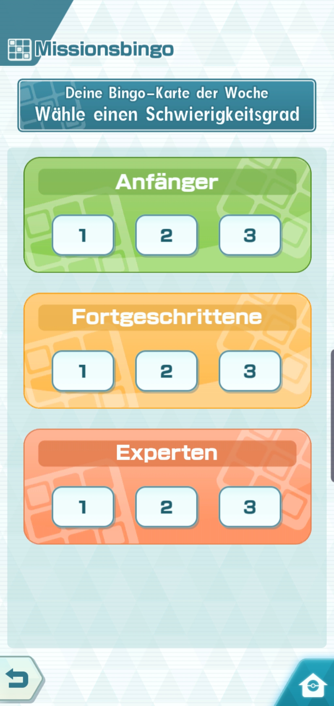 Die Missionen gibt es stets in 3 verschiedenen Schwierigkeitsstufen, welche jeweils 3 eigene Bingokarten enthalten. Je höher die Schwierigkeitsstufe desto besser sind die Belohnungen für das erfolgreiche abschließen einer Aufgabe oder des gesamten Bingo.