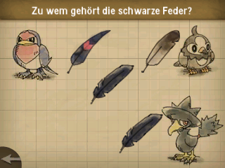 Geht nach der Fragerunde anschließend nach rechts und befragt auf dem Weg dorthin die Passanten und Pokémon auf die ihr trefft. Auf einem Tisch beim Cafe findet ihr schließlich eine Feder von Schwalbini.