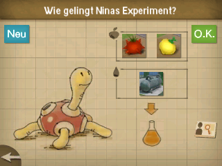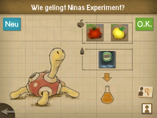 Gebt nun den Zugangscode, den ihr herausgefunden habt, ein: Dreieck, Stern, Raute, Quadrat. Besucht den hinter der Tür liegenden Garten und befragt alle Pokémon die ihr findet. Geht dann rechts heraus und redet mit Clavion, welches euch aufträgt, Nektar von Pottrott zu besorgen. Redet mit Nina und Pottrott und besorgt dem Pottrott eine Schale voll mit Beeren, um an den Nektar zu kommen. Hierfür müsst ihr zunächst rechts den Garten verlassen und in Carlos Labor gehen. Untersucht dort den Mülleimer, um eine Batterie zu finden. Redet mit Rotom und Carlos und geht anschließend in das nächste Labor.