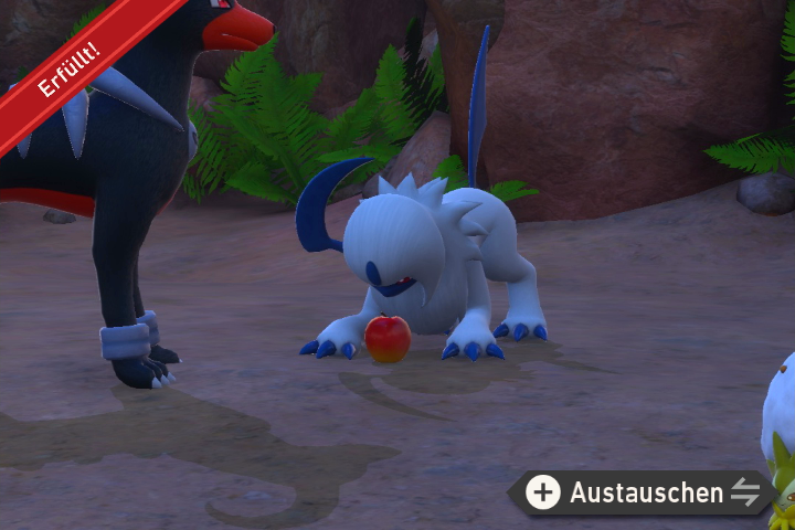 - Rita hat hier in der Gegend ein weißes, vierbeiniges Pokémon gesehen. Lass uns nachsehen und ein Foto davon machen, wie es einen Samtapfel frisst!
