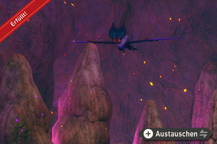 - Fahrt ins Innere der Ruine und spielt Skelabra, welches sich direkt an dem ersten Schrein befindet, Musik vor. Es wird daraufhin wegfliegen. Fahrt einmal um die Säule herum und werft einen Samtapfel auf dem Boden unter Skelabra und danach gegen Skelabras Kopf. Es wird zunächst etwas tiefer fliegen. Werft erneut Samtäpfel gegen Skelabra und welche auf den Boden bis es einen Samtapfel isst. Hat es das getan müsst ihr Musik einsetzen, damit es einen besonderen Tanz nach dem Essen ausführt.