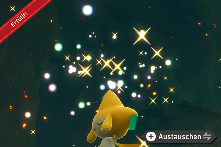 - Fahrt in die Ruine und werft auf jede Kristallblume im Innenraum eine Lumina-Kugel und weckt Jirachi vom lilafarbenen Schrein auf indem ihr Lumina-Kugeln auf es werft. Fahrt bis kurz vor das Ende der Route und setzt Musik ein, wenn Jirachi vor dem Golgantes ist. Es wird im den Lichtstrahl fliegen und anschließend rechts von euch stehen bleiben. Setzt Musik ein und fotografiert wie Jirachi herumfliegt.