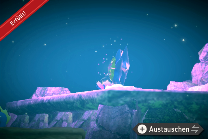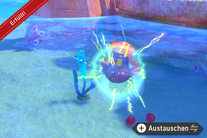 - Fahrt bis zum Ende des Gebiets bei dem man von unten nach oben Richtung Wasseroberfläche fährt. Werft eine Lumina-Kugel auf die zweite Kristallblume, sodass sich vier Liebiskus darum versammeln. Setzt dann Musik ein, damit sich die Liebiskus hinlegen.