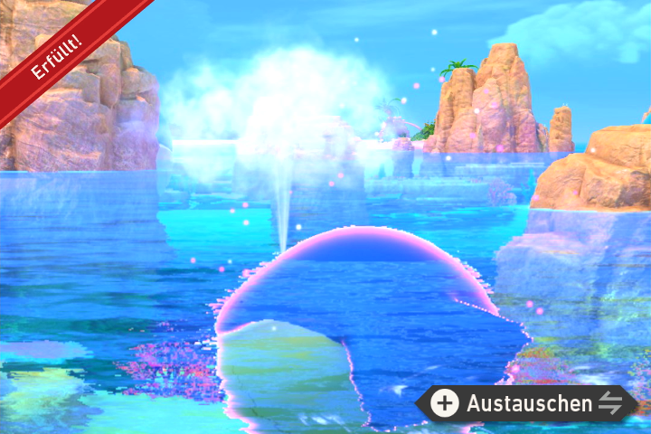 - Fahrt über die große freie Fläche nach den Wailord und dreht euch anschließend um sobald Machomei und Tohaido ihr Wettrennen abgeschlossen haben, um ein Wailmer zu finden. Bewerft es schnell mit einer Lumina-Kugel, damit es mit Wasser spritzt.