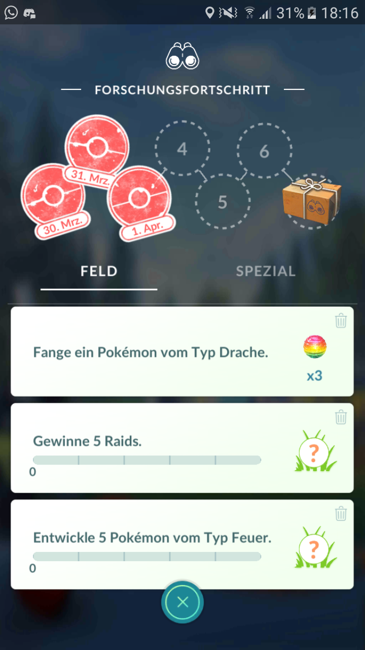 - Feldforschungsprojekte: Für das Drehen von Fotoscheiben bei PokéStops hat man die Möglichkeit Feldforschungsprojekte zu erhalten. Sie können während dem normalen Spielen abgeschlossen werden. Feldforschungsprojekte können durch einen Klick gelöscht werden.
