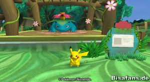 Zu Bisaflor geht es nach links hinter der Brücke. Am Tor steht Glibunkel, der dich jedoch nach einem kurzen Gespräch für 200 Beeren passieren lässt. Gehe anschließend durch das Tor um Bisaflor und sein Minispiel zu erreichen. Dort kommt es dann zu einem Gespräch. Bisaflor verlangt, dass du zuerst Glibunkel und Habitak in ihren Herausforderungen besiegst, bevor du bei ihm im Minispiel antreten und Endivie befreien darfst. Glibunkel steht am Tor und Habitak ist in der Mitte ganz rechts bei den Türmen. Glibunkel muss in einem Kampf besiegt werden, woraufhin es dein Freund wird und Sichlor in der Zone erscheint. Bei Habitak machst du deine erste Turnübung, bevor auch Habitak dein Freund wird. Kehre dann wieder zu Bisaflor zurück. Er wird dir nun erlauben sein Minispiel zu spielen.
