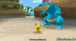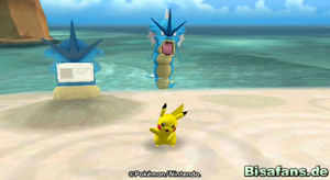 Vom Eingang aus kannst du schon Azurill und Lahmus sehen. Diese reden von einem Streit zwischen Garados und Impergator, der dazu führte, dass die Insel-Verbindungsbrücken zerstört wurden. Wir erhalten von den beiden den Tipp, dass wir mit Lapras reden sollten, wenn wir über das Meer zur Eiszone wollen. Nach dem Gespräch sind die beiden dann erst einmal weg und wir können das Gebiet erforschen.