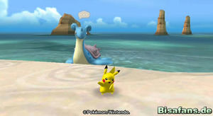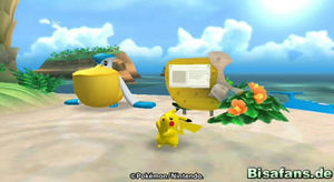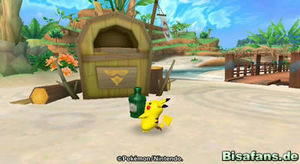 Als Lohn gibt es den von Garados versprochenen Prismensplitter und Impergators Auftrag ist damit auch erledigt. Bevor du aber zu Impergator gehst, solltest du die neu erschienenen drei weiteren Flaschen in den Container werfen um weitere Deko zu erhalten. Ferner erscheint auch Krebscorps dabei am Strand. Nach der sechsten Flasche kannst du auch zu Wailord ganz unten rechts auf der Minikarte gehen um ihn ebenfalls als Freund zu gewinnen. Danach geht es ab zu Impergator, der nun den Felsen unten links für dich wegräumt, so dass du endlich Lapras ganz unten links erreichen kannst. Dabei entdecken du und Plinfa auch einen alten Heißluftballon, den Plinfa für dich zum Treffpunkt bringt. Vielleicht nützt er später noch etwas...