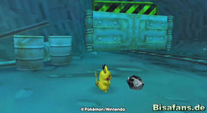 Das Gespräch mit den Zubats war nicht ganz so wichtig, doch spielte ich mit ihnen Fangen, damit sie meine Freunde werde. Am Ende des Weges (ganz oben links auf der Minikarte) kommt es zu einem Gespräch mit einem Stollunior. Dieses würde gerne ein Eisenerz aus einer der umstehenden Kisten haben. Klar, dass wir helfen wollen, doch kam bei mir aus der ersten Kiste ein Magnetilo heraus (nach dem dritten Magnetilo kam auch ein Magnezone!). Die gesuchte Kiste war bei mir in der Ecke, wo auch Stollunior war (bei dem gelblich/schwarz-gestreiften Tor in der Kiste). Stollunior erwähnt dabei, dass Flunkifer wohl gerne an den Schienen knabbert. Interessant...