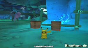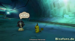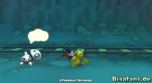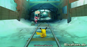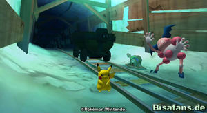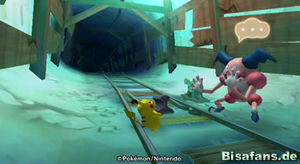 Hast du Relaxo die große Beere gebracht, gibt es eine überraschende Szene, bei der auch Phanpy und Raichu erscheinen. Wir können uns aber erst einmal aus dem Wasserbereich um Relaxo herum das Schienenstück schnappen und dieses den weiten Weg zu Pantimos im unteren rechten Teil der Minikarte tragen. Unterwegs triffst du übrigens auch auf Machomei und seine Turnübung sowie Bollterus und sein Minispiel. Ich ging aber erst einmal zu Pantimos, welches daraufhin die Schienen reparierte. Nun fehlt nur noch die Lore, die Kaumalat ja herausgeben wollte, wenn die Schienen repariert sind. Also auf zu Kaumalat (links von Plaudagei im Tunnel).