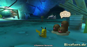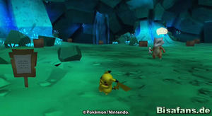 Direkt am Anfang der Höhlenzone lernen wir Pantimos kennen. Dieses bittet uns darum ein fehlendes Schienenstück zu finden, damit die Lore in der Höhle wieder fahren kann. Da wir mit dieser Lore in die Magmazone müssen, wo nach Bisaflor und Impleon das letzte Mitglied des Trios, Lohgock, wartet, ist es in unserem Interesse hier zu helfen. Helfen sollen uns hierbei die Zubats, die hier herumfliegen.