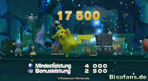 In diesem Minispiel musst du eine Kugel immer wieder daran hindern an dir nach unten vorbei zu fallen. Greife die Kugel immer an und schleudere sie nach oben auf die nummerierten Türen hinter Bollterus um Punkte zu sammeln. Dabei gibt es zwei Sachen zu beachten. Zum einen verwandelt sich der Ball nach einer Attacke von dir ein einen Wuchtball, der an Bollterus und allen Hindernissen/Pokémon durchschießt und zum anderen werden die Tore hinter Bollterus mit jedem Treffer wertvoller. Die Zahlen auf den Toren geben an, wie oft du diese schon getroffen hast. Der Wert reicht von 1 (Anfang) bis 9 (Maximum). Besonders hohe Punkte lassen sich entsprechend erreichen, wenn du eine oder mehrere Tore mehrfach getroffen hast. Die Mindestleistung von 4000 Punkten sollte relativ leicht zu schaffen sein. Wähle als Pokémon am besten eines, welches nicht zu klein ist, damit der Ball nicht so leicht verloren gehen kann. Ach ja - du hast drei Leben (Bälle) - viel Spaß und Erfolg!