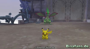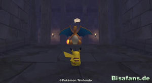 Schreite voran bis du auf Glurak triffst. Dieses wird dich hier willkommen heißen. Natürlich kannst du es auch zum Kampf fordern um es als Freund zu gewinnen. Ein Stück weiter links wartet Hoppspross, welches uns aber nur passieren lässt, wenn wir Absols Minispiel gemeistert haben. Also gehen wir rechts von Glurak (blaue Markierung auf der Minikarte) und fordern Absol heraus...