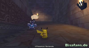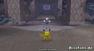 Hast du das Minispiel von Absol geschafft, erhältst du den 12. Prismensplitter und kannst den Weg an Hoppspross vorbei nun passieren. Dabei wird Hoppspross übrigens dein Freund ;) Direkt hinter Hoppspross musst du wieder einmal einen Hebel rammen, damit du die Schlucht überqueren kannst. Ramme den Hebel auf der anderen Seite unbedingt an, damit die Brücke sich wieder in eine andere Position dreht. Du wirst dies bald brauchen und sparst dir so ein wenig Lauferei ;) Gehe dahinter direkt die Rampe hoch - der untere Weg führt nur zu blockierten Durchgängen.