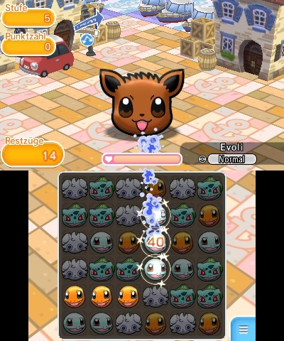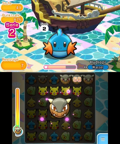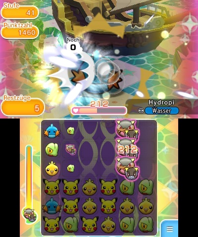 Serien erhöhen zudem die KP, die pro Angriff abgezogen werden und erleichtern euch mehrere Reihen pro Schritt zu absolvieren. Löst ihr eine Reihe auf, fallen neue Pokémon von oben nach und können weitere Dreier-Reihen bilden. Ist dies der Fall, wird von einer Serie gesprochen, die euren Punktestand und die Schlagkraft stark erhöht.
