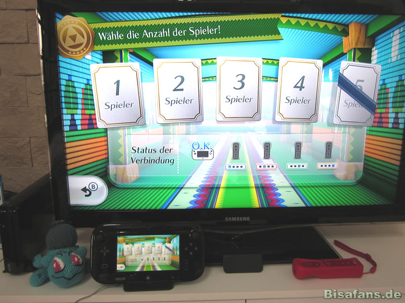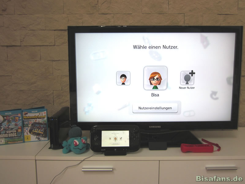 Die oberen Fotos zeigen die aufgebaute Wii U mit Bisa. Das GamePad befindet sich hier in der Ladestation und kann aus dieser natürlich herausgenommen werden. Der rechte rote Wii Remote ist nicht enthalten. Insbesondere für Wii-Spiele ist jedoch ein Remote-Controller notwendig. Neu kaufen muss man ihn nicht, da man generell alles Zubehör sowie Spiele der alten Wii weiter verwenden kann. Wer jedoch keine Wii vorher besaß, sollte sich für rund 45 Euro einen Remote Controller unbedingt mit einplanen oder eine Spiele Spezial-Edition kaufen, bei denen gelegentlich auch Remote Controller beiliegen. Der Hintergrund ist schlicht der, dass alle Multiplayer-Titel für den zweiten Spieler einen Remote-Controller erfordern und dieser teilweise auch im Solospiel nützlich sein kann.