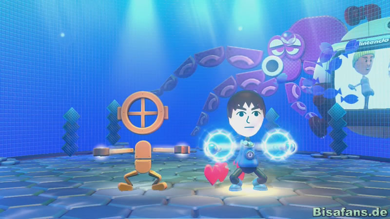 In "Tanz den Kraken" müssen wir einem Vortänzer die Bewegungen möglichst zeitlich passend nachahmen. Anstatt jedoch nur Tasten zu drücken, sind hier die unterschiedlichsten Bewegungen notwendig, die nur das GamePad ermöglicht. Eine besonders originelle Schwierigkeit ist, dass der Vortänzer sich gerne auch mal dreht und man die Aktionen dann spiegelverkehrt durchführen muss! Je nach Aktion des Vortänzers muss man auch mal auf den Fernseher und mal auf das GamePad schauen.