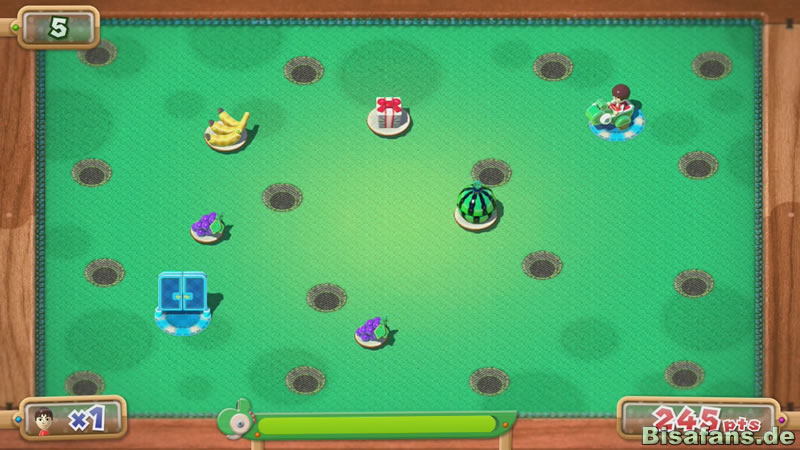 Das letzte Spiel mit Yoshi ist dann das einzige richtige Knobelspiel. Am Fernseher sind hier Früchte zu sehen, die man mit Yoshi einsammeln muss. Den eigentlichen Weg von Yoshi muss man jedoch am GamePad mit einem Touchpen einzeichnen. Soweit so einfach, doch werden am GamePad nur die Start- und Endpunkte angezeigt. Anhand der Hintergründe oder anderer Merkmale wie z.B. vorbeifliegenden Wolken, muss man Positionen abschätzen. Nach und nach steigt hier der Schwierigkeitsgrad dadurch, dass es eine vorgegebene Reihenfolge gibt, Fallgruben und einsammelbare Extras wie z.B. wertvolle Markierungshilfen. Für Tüftler eine große Herausforderung und in unseren Testrunden ein Favorit unter den Solospielen.