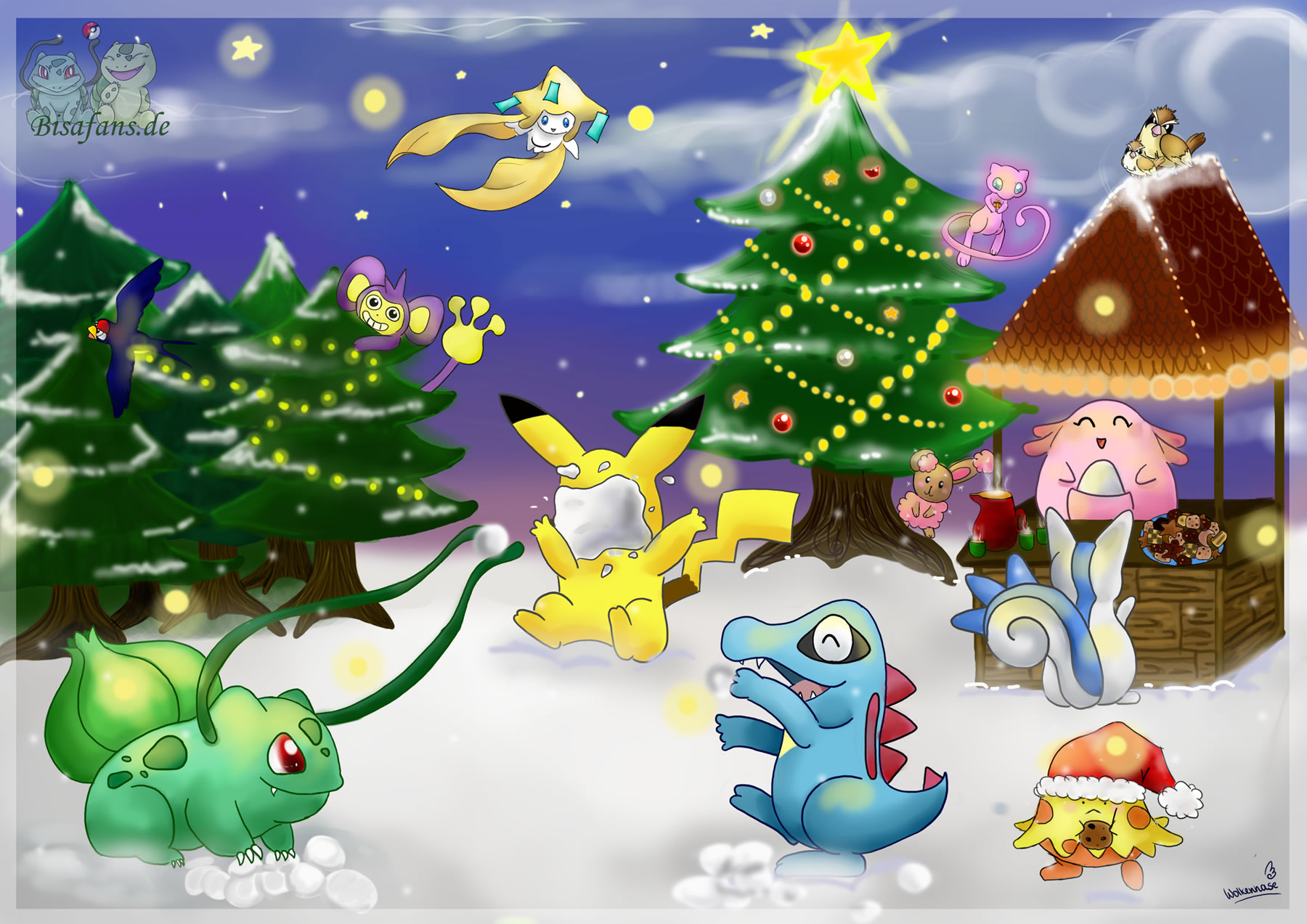 Auch dieses Jahr wurden ab dem 1. Dezember täglich wunderschöne Einsendungen der Fans veröffentlicht. Die Verlosung der Preise im Wert von mehreren hundert Euro wurde bereits abgeschlossen und die Preise an die Gewinner verschickt. Auch die Umfrageergebnisse wurden inzwischen veröffentlicht und verraten euch einiges über die vielen Besucher von Bisafans sowie die Fans von Pokémon allgemein! Das Adventskalenderbild wurde in diesem Jahr von Wolkenhase gezeichnet!