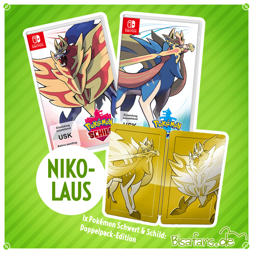 Hinter dem Türchen zu Nikolaus verstecken wir ein weiteres Gewinnspiel! Wir wollen allen Pokémon-Fans eine besondere Freude machen: In Kooperation mit Nintendo verlosen wir deshalb ein Pokémon Schwert und Schild-Doppelpack, welches sowohl Pokémon Schwert, als auch Pokémon Schild beinhaltet. Ebenfalls im Doppelpack enthalten ist ein goldenes Steelbook. Neben diesem Gewinn, kann sich der Gewinner außerdem über Sticker und ein Schlüsselband freuen!. Zu gewinnen gibt es also folgendes: