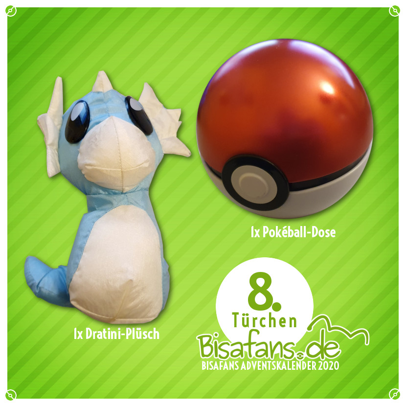 Hinter dem achten Türchen versteckt sich ein kleines Merchandisepaket! Wir verlosen ein Dratini-Plüschtier und passend dazu eine Pokéball-Dose, in der unterschiedliche Dinge aufbewahrt werden können. Beide Gewinne wurden uns von unserem Partner LottiCards zur Verfügung gestellt! Zu gewinnen gibt es also folgendes für einen glücklichen Gewinner: