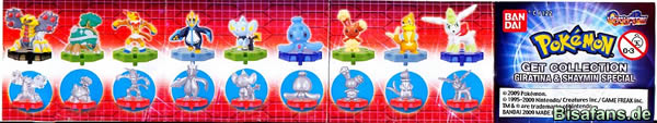 Von der Firma Ban Dai gibt es kurz vor Weihnachten noch eine neue Pokemon Serie für das Jahr 2010. Die neue Serie – Giratina & Shaymin Special erinnert an die in diesem Jahr erschienene Serie Platinum World. Schon bei dieser Serie gab es die Pokemon Figuren in bunten Farben und im edlen Platin. Die Serie umfasst 18 Figuren, wobei die jeweils neun Pokemon einmal als Farbversion und einmal als Platinversion vorhanden sind. Alle Pokemon befinden sich, wie auch in der Platinum World-Serie auf einem kleinen Sockel.