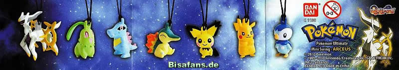 Bei der Firma Ban Dai startet das neue Jahr 2011 gleich mit einer ganz neuen Pokemon Serie – der Pokémon Ultimate Mini Swing Arceus – Serie. Wie gewohnt sind die Figuren in durchsichtigen Kapseln enthalten. Die Serie umfasst diesmal 7 verschiedene Pokémon Anhänger, die z.B. als Schlüsselanhänger, für den Nintendo DS als Anhänger, etc. genutzt werden können. Die Serie umfasst verschiedene Pokémon aus verschiedenen Generationen.