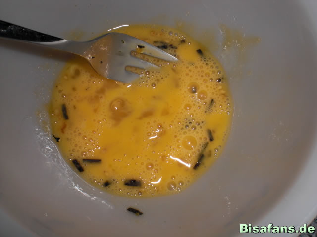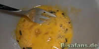 1. Zuerst presst ihr den Tofu vorsichtig in einem Handtuch oder in einem Zewatuch aus, um ihn von der Feuchtigkeit zu befreien. Dann schneidet ihr ihn in Scheiben. Nun quirlt ihr ein Ei zusammen mit etwas Salz und Furikake auf.