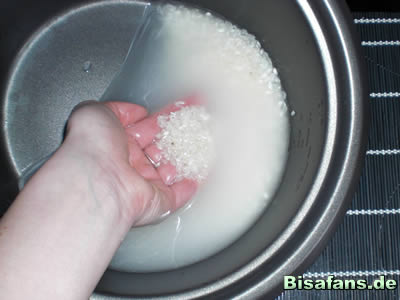 Gebt zuerst den Reis in einen Topf/Reiskocher und und wascht ihn, dieses geht wie folgt (Infos zum Sushi-Reis gibt es weiter unten):