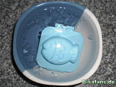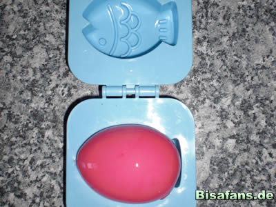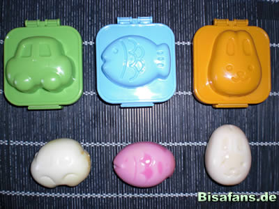 Die heißen, abgeschälten Eier werden in angefeuchtete Eierformen gegeben und gut verschlossen. Im Anschluss werden die gefüllten Formen in kaltes Wasser gelegt und verweilen dort gute 15 Minuten. Zum Schluss hat man ein schönes Eierauto oder einen Eierfisch^^
