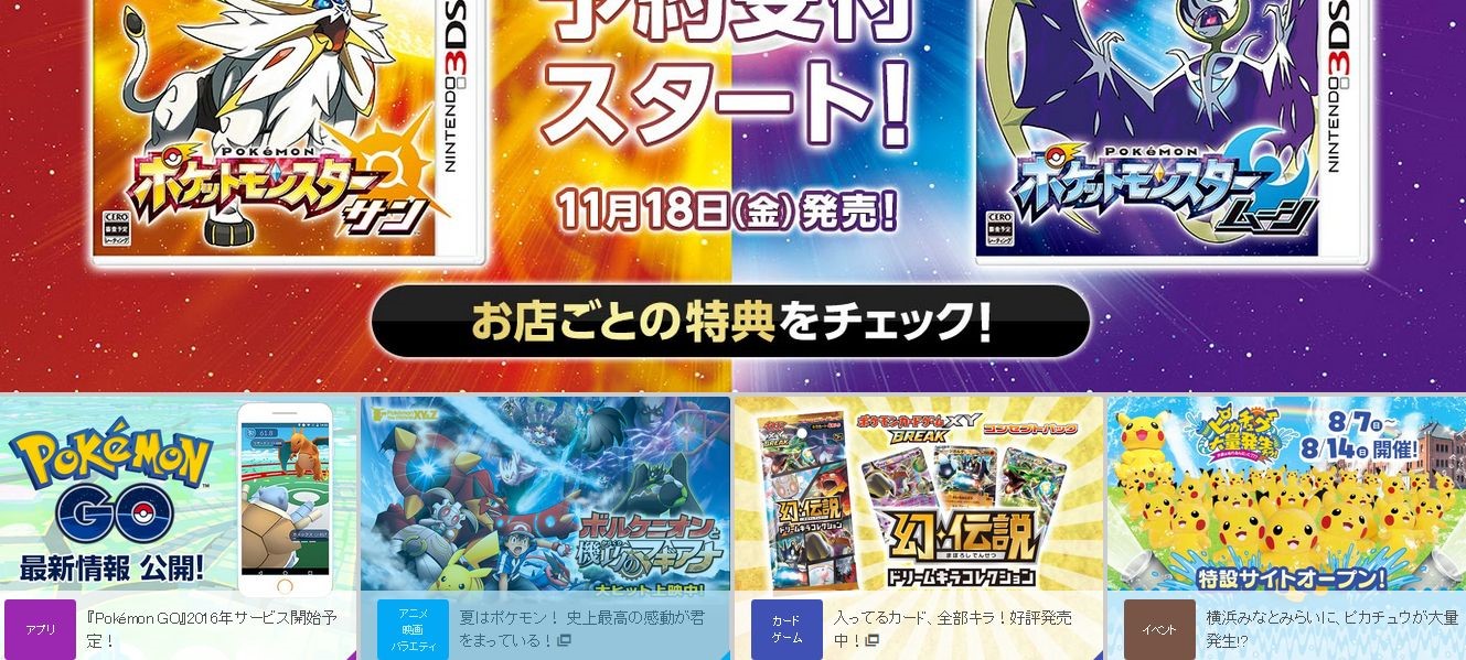 Website-Sektionen mit den Labels „Watch Pokémon TV“, „Play Games“ und „Attend Events“ ein, während es auf der