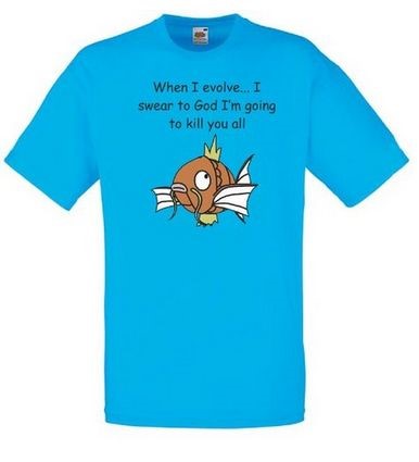 Meine Recherche ergab, dass Selbstparodie und Fremdreferenzen insbesondere auf Kleidung zu finden sind, bei der fragwürdig ist, ob sie über eine offizielle „Pokémon“-Lizenz verfügt. Deren Hersteller intendieren, sich fremdes/geschütztes Material „anzueignen“ und mit einer einfallsreichen Allusion zu verquicken. So partizipieren externe Unternehmen auf finanzielle Weise an dem kommerziellen Erfolg von der Pokémon Company, Game Freak und Nintendo (wie legal diese Teilhabe ist, sei an dieser Stelle sekundär). Abbildung 30 zeigt ein T-Shirt, welches zusammen mit einer Silhouette des Pokémon Pikachu auf das Logo des Sportartikelherstellers „Puma“ anspielt. Ein anderes Shirt zeigt das Pokémon Karpador. Dieses genießt unter Fans einen fragwürdigen Kultstatus: Es verfügt lediglich über eine einzige Attacke und diese richtet keinerlei Schaden an. Simpel gesagt ist Karpador ein sehr unnützes Pokémon. Auf dem Shirt ist Karpador mit einem nachdenklichen Gesichtsausdruck zu sehen, daneben stehen die Worte „When I evolve…I swear to God I’m going to kill you all!“ (siehe Abbildung 31). Tatsächlich entwickelt sich Karpador zu einem sogenannten Garados, einem besonders starken Pokémon des Typs „Drache“. Das Karpador-Shirt erlaubt es sich, ein unter Fans gängiges Klischee zu untergraben.