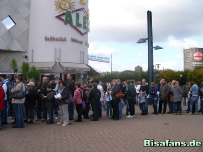 Neben dem üblichen Prozedere war ich gegen 10.30 Uhr in Oberhausen, wo ich auch freundlich von Dustin aka Platinmaster in Empfang genommen wurde. Zusammen mit ihm und meinem Freund Stefan ging es vom Hauptbahnhof zum Veranstaltungsgelände beim CentrO Oberhausen, einem riesigen Einkaufscenter, in dem am selben Tag auch der dritte Apple Store Deutschlands eröffnen sollte. So traf ich auf dem Gelände gegen 11 Uhr ein. Es herrschte schon reger Betrieb und eine mir bekannte Person namens Marc stand in der Warteschlange für die Anmeldung ganz vorn. Ich für meinen Teil stellte mich noch nicht an, sondern lief erst einmal durchs CentrO, aß etwas und kam gegen kurz vor 12 Uhr wieder zurück. Inzwischen waren es einige Fans mehr geworden, die da warteten. Da die Anmeldung gerade erst begann, beschloss ich eine kleine Fototour zu machen und etwas von der Bühne zu filmen.