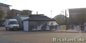 Wir haben es morgens gegen halb zehn. Nachdem ich die Nacht freundlicherweise bei Dustin verbringen durfte, konnte ich mit ihm früh das Gelände erkunden. Mitarbeiter von Nintendo waren schon mit dem Aufbau beschäftigt, doch so recht war noch nichts los, so dass die Zeit zum schießen von Fotos nutzen konnte. Ich traf recht schnell Jan und seine Schwester sowie Marc und Miriam, die damit begannen, zwei Strandmuscheln vor dem CentrO aufzubauen. Während des Aufbaus quasselte ich noch hier und da in der Gegend rum. Nach dem Aufbau machten Dustin und Ich aber noch einen kleinen Lauf durch das CentrO und seine große Auswahl an Geschäften. Als ich wieder ankam war schon mehr los und eine kleine Schlange bildete sich vor der Anmeldung. Ich breitete mich in einer der Strandmuscheln aus und beobachtete die Gegend. Auch Fotos machte ich einige.