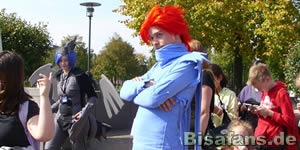 Zwischendurch traf dann auch noch der Simon ein. Dann wurde bereits etwa eine halbe Stunde früher als geplant die Anmeldung geöffnet um den Scharen von Besuchern gerecht zu werden. Es füllte sich immer mehr der Platz vor dem CentrO und Oli Petszokat begann mit seiner Moderation und brachte alle Fans in richtige Stimmung. Die Anmeldeschlange bildete sich inzwischen über die Brücke bis zu den Mofastandplätzen. Das lag wohl vornehmend an dem guten Wetter, was den ganzen Tag herrschte. An der Strandmuschel traf ich dann noch auf Christina die ich letztes Jahr kennenlernte. Es freut mich immer wieder, alte Bekannte zu treffen. Nachdem ich noch etwas gegessen hatte, quasselte ich noch hier und da und fertigte einige Con-Hon Einträge an. Nebenbei verfolgte ich noch immer das Programm. Oliver Petszokat zeigte auch dieses Jahr wieder, dass er weiß, wie es in der Welt der Pokémon zugeht und wie man die Massen begeistern kann. Gegen drei traf dann auch, etwas verspätet, Marie ein.