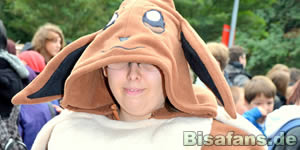 Ein Fan im Evoli-Kostüm und eine der vielen Gewinnspiele auf der